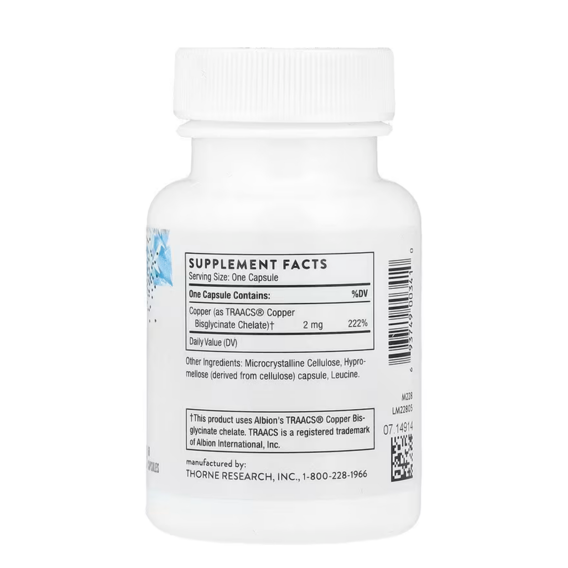 Copper is a trace mineral that is essential for bone health, connective tissue health, cardiovascular health, lipid metabolism, neurological health, and skin health.* It's also a component of the antioxidant enzyme superoxide dismutase. Because copper and zinc compete with each other for absorption, an individual taking a high amount of zinc (for example, 50 mg daily for an extended time period) can develop a copper deficiency. A copper deficiency can render many cell types, including fat cells and blood cells, more susceptible to oxidation.* For this reason, zinc supplementation should be accompanied by copper supplementation.* In a clinical setting, copper supplementation protected red blood cells from oxidation.* Thorne's Copper Bisglycinate provides an optimally absorbed form of copper.*