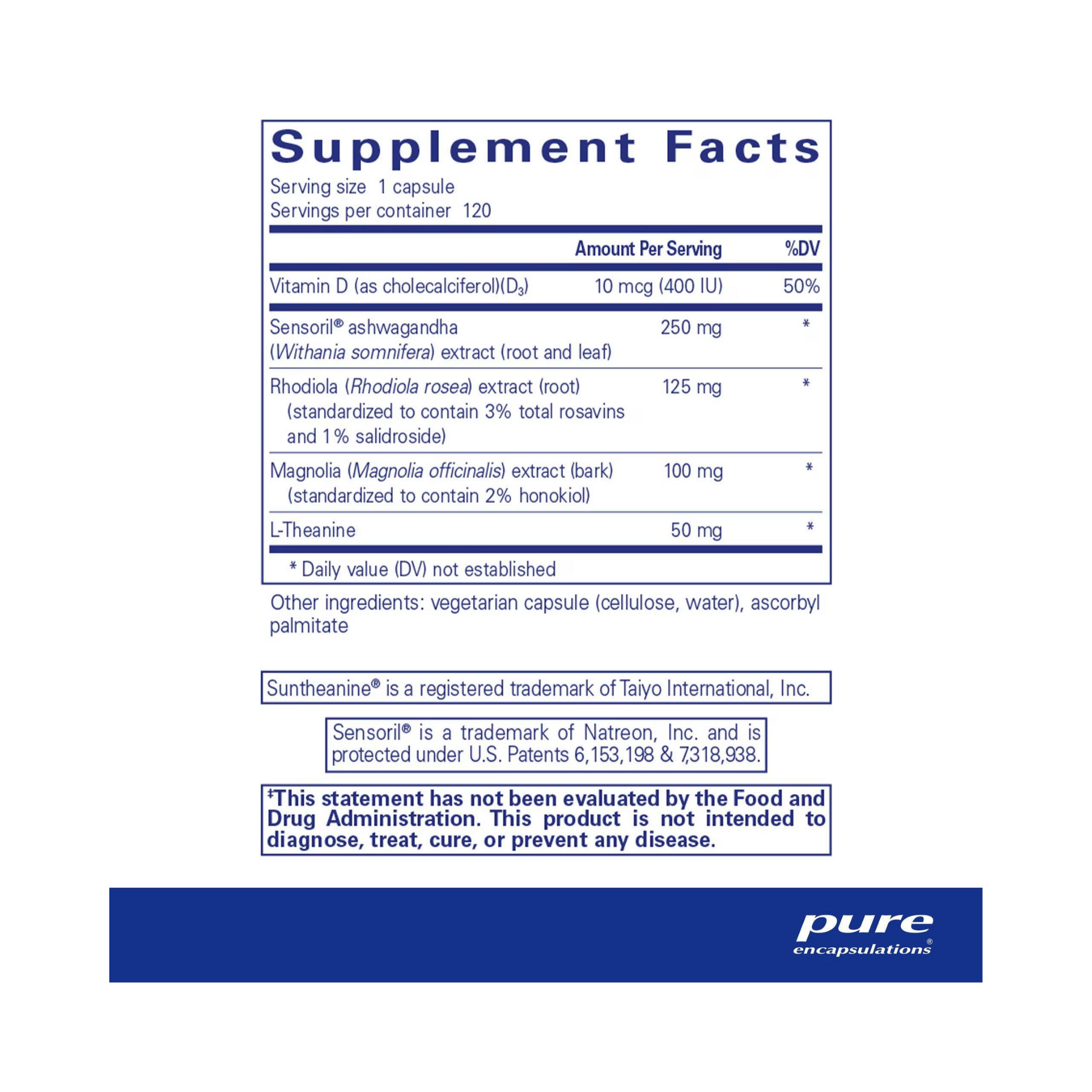 Cortisol, released in response to stress, is mainly produced by the adrenal cortex. Intra-abdominal adipocytes also produce cortisol. In a recent study, Sensoril®ashwagandha extract promoted relaxation and maintained healthy cortisol and C-reactive protein levels. Subjects in this randomized, double blind, placebo-controlled study reported support for healthy sleep, positive mood and cognitive function. The effects were most pronounced for subjects taking 500 mg per day compared to lesser doses. Rhodiola and magnolia may also maintain healthy adrenal cortisol activity and offer support for occasional stress, mood and emotional well-being. l-Theanine supports normal brain alpha-wave activity, helping calm the sympathetic nervous system for a relaxing effect. Recent research suggests that maintaining healthy vitamin D levels supports normal cortisol production within abdominal adipocytes.*