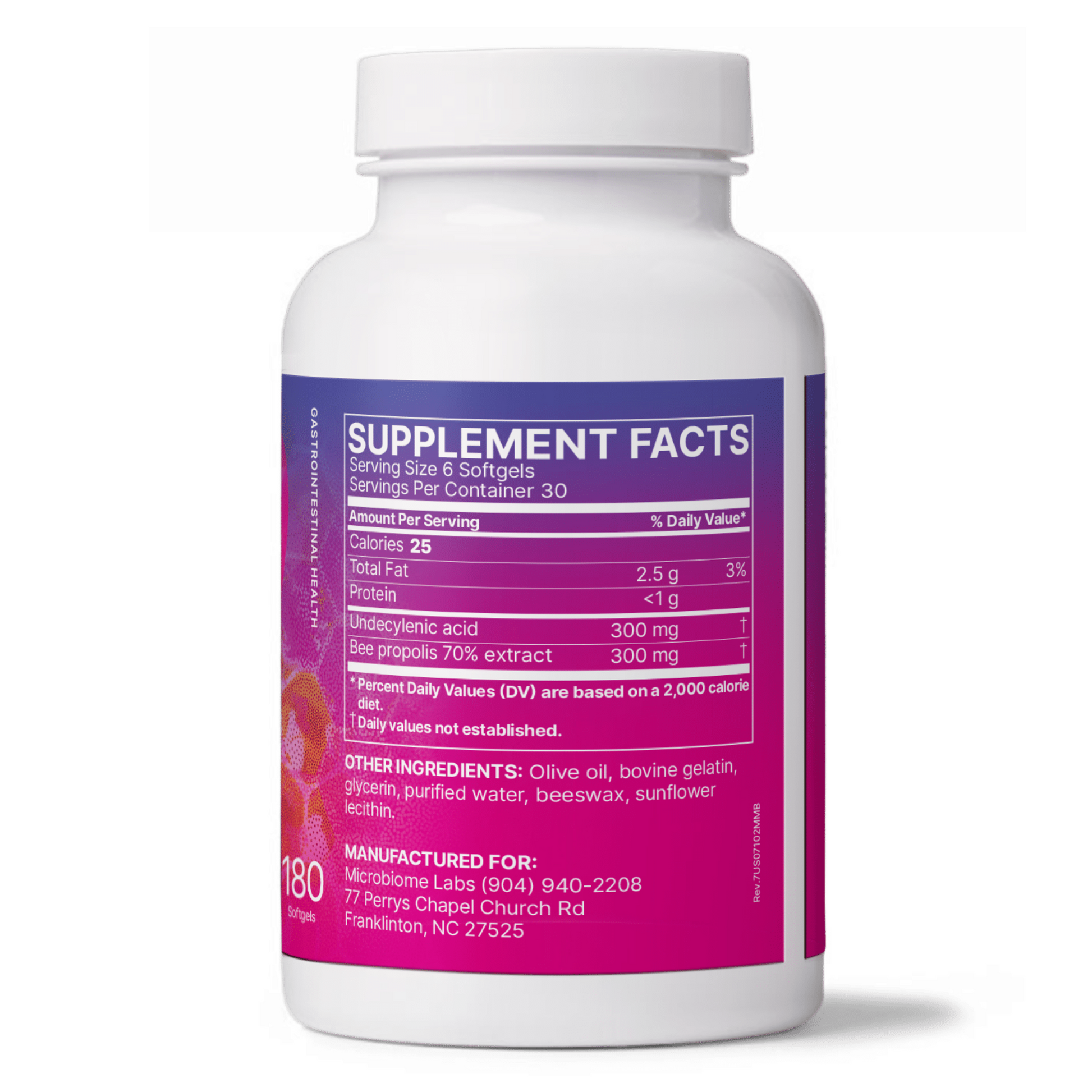 Undecylenic acid is an organic fatty acid derived from castor bean oil that supports a healthy balance of yeast in the gut. Bee propolis is a plant resin that bees use to line their hives.