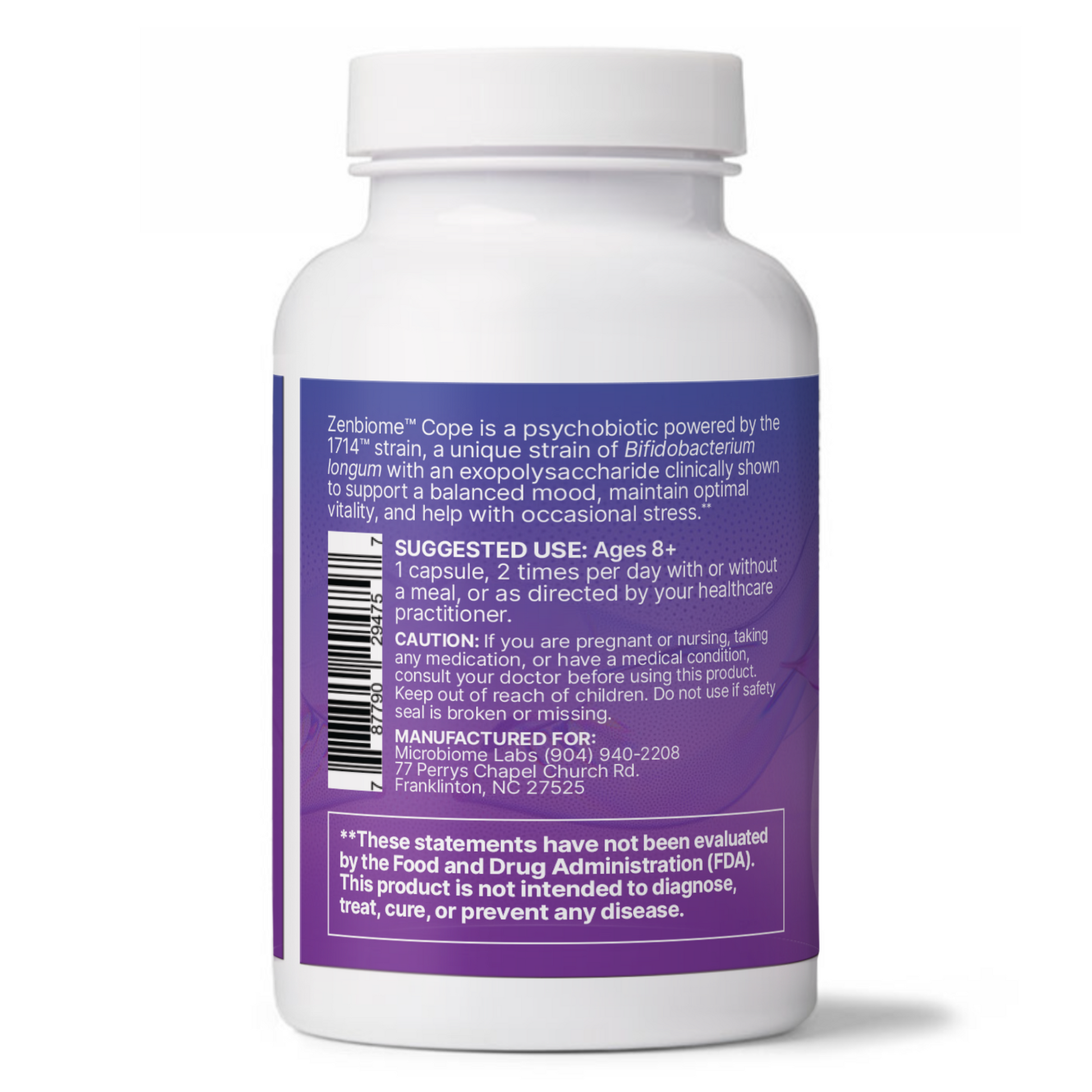 ZenBiome Cope™ is designed to help clients better handle life’s occasional stressors. ZenBiome Cope™ pairs the well-researched psychobiotic 1714™ with other vital nutrients like B vitamins and herbal extracts to provide targeted support for coping with day-to-day, periodic stressors and mood changes.